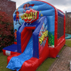 Dit stoere superhelden met glijbaan springkussen is overdekt en zorgt voor uren speelplezier.